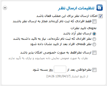 با استفاده از جعبه تنظیمات ارسال نظر که در پایین سمت چپ صقحه ارسال مطلب وجود دارد میتوانید نحوه ارسال نظر را برای مطلبی که در حال نگارش آن هستید انتخاب کنید.