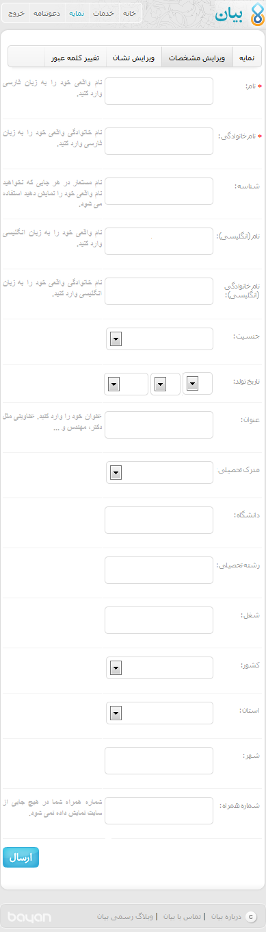 نکته: بجز نام و نام خانوادگی فارسی، پر کردن کادر های دیگر فعلا الزامی نیست.