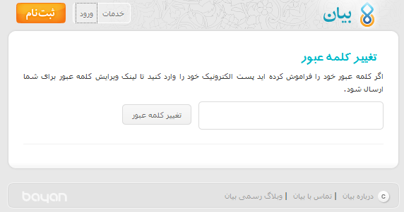 در کادر موجود آدرس پست الکترونیکی خود را که بوسیله آن در سامانه بیان ثبت نام کرده اید درج نمایید.