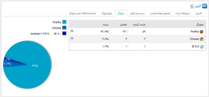 اطلاعات اینکه کاربران وبلاگ از کدامیک از مرورگرهای اینترنت برای مشاهده وبلاگ شما استفاده می کنند را می توانید از این بخش دریافت کنید.