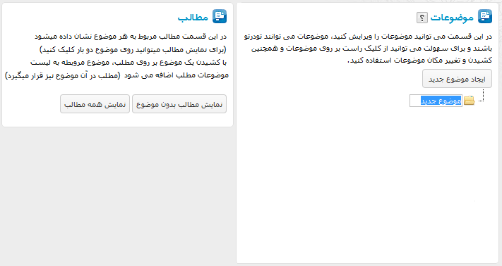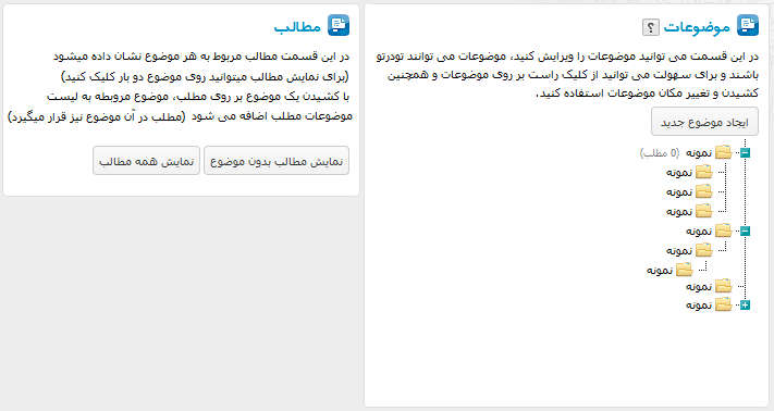 نمایش مطالب بدون موضوع: مطالبی را که در هیچ موضوعی دسته بندی نکرده باشید با کلیک کردن روی این کلید نمایش داده خواهند شد و می توانید برای آنها موضوع انتخاب کنید.