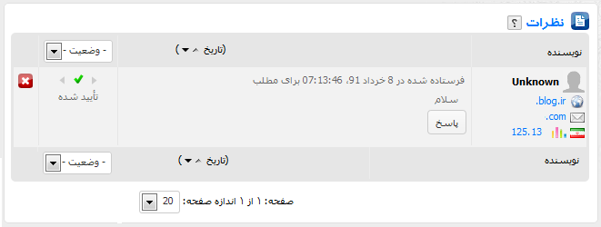 نکته: با کلیک کردن روی ip میتوانید نظرات دیگری که این کاربر برای ویبلاگ شما ارسال نموده مشاهده کنید.