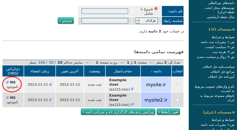 در این صفحه برای ویرایش NSهای یک دامنه، از لینک موجود در ستون آخر مربوط به آن دامنه استفاده کنید، (که با علامت قرمز مشخص شده است)