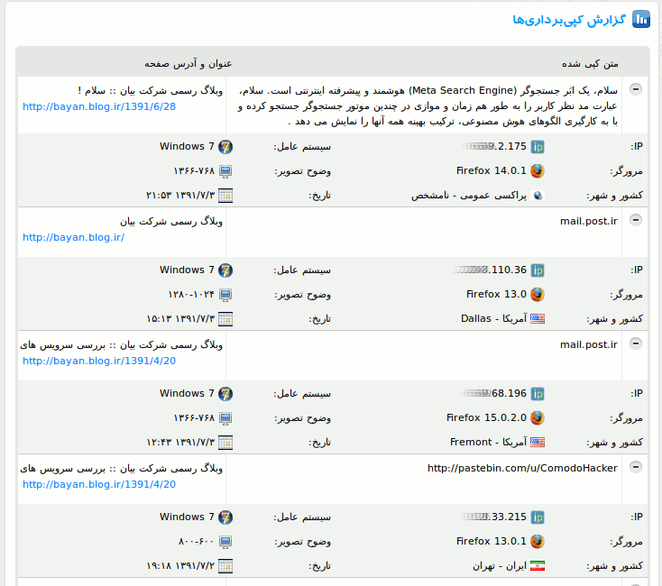 در قسمتی که ذیل هر یک از ردیف های جدول وجود دارد، اطلاعات مربوط به کاربری که مطالب را از روی وبلاگ شما کپی کرده بعلاوه متن کامل کپی شده نمایش داده می شود.
