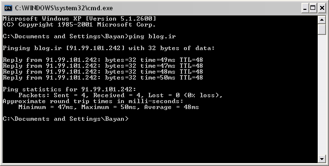 خروجی دستور ping blog.ir را به صورت متنی یا تصویری ذکر کنید. (برای این کار ابتدا باید Command prompt را باز کنید، راهنما). در پنجره command prompt با کلیک راست (گزینهی Mark > انتخاب متن > کلید Enter) میتوانید متن را کپی کنید. با استفاده از کلیدهای Alt + PrtScr نیز میتوانید یک تصویر از صفحه (مانند تصویر زیر) تهییه کنید. (راهنمای ۱ و ۲)