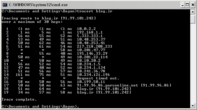 خروجی دستور tracert blog.ir را نیز در گزارش ذکر کنید (کاربران linux و mac باید از دستور traceroute استفاده کنند). خروجی نمونه این دستور مانند زیر است.(در هنگام گرفتن تصویر، در صورت لزوم اندازهی صفحه را بزرگتر کنید و دقت کنید که خطوط ابتدایی نیز وجود داشته باشند)