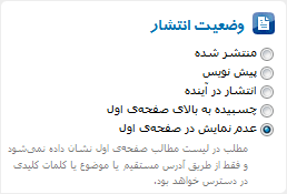 در حالت "عدم نمایش در صفحه اول" بر خلاف موارد بالا مطلب شما در صفحه اول پست نمی شود و تنها از طریق طبقه بندی موضوعی که درون آن قرار گرفته و یا از طریق لینک دیگری که برای آن در نظر گرفته باشید قابل مشاهده است.