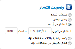 قسمت "وضعیت انتشار" وضعیت مطلب شما را بعد از ذخیره کردن تعیین میکند. در حالت پیشفرض گزینه "منتشر شود" علامت خورده که در این حالت مطلب، پس از ذخیره شدن، در بالای صفحه اصلی وبلاگ به نمایش در خواهد آمد.