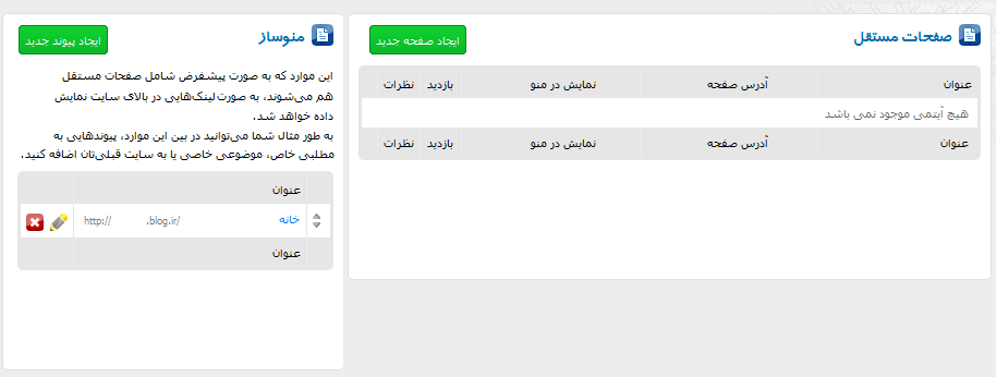نکته: صفحات مستقلی که در هنگام ایجاد، وضعیت انتشارشان "عدم نمایش در منو" انتخاب شده؛ در منوی وبلاگ نشان داده نمی شود اما کاربران با استفاده از موتور های جستجو و یا آدرس مستقیم آن میتوانند صفحه مستقل را مشاهده کنند.