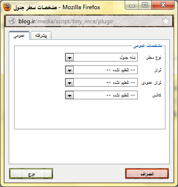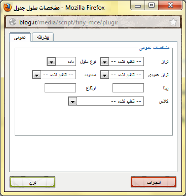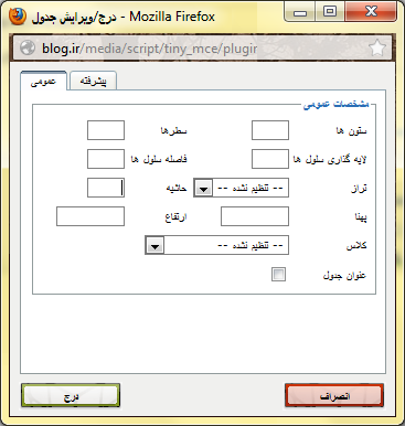 با استفاده از این کلید مبتوانید یک جدول در مطلب خود درج کنید و آن را ویرایش کنید. با کلیک کردن روی آن پنجره مقابل نمایش داده می شود:
