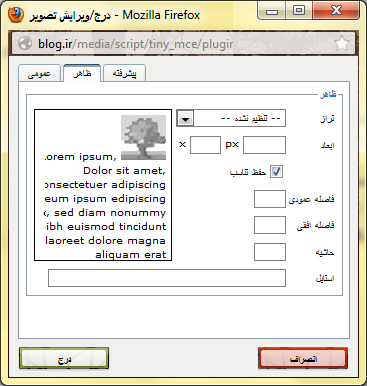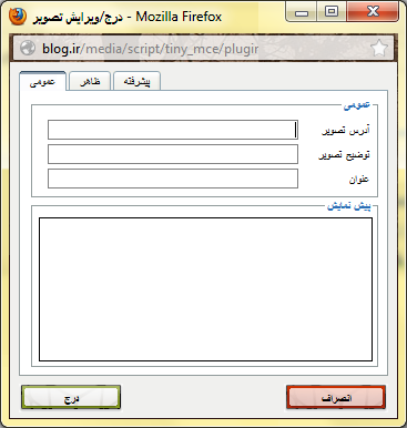 نکته: اگر url یک تصویر را بصورت کامل بدانید هم میتوانید با کلیک کردن روی ابزار با درج آدرس کامل در کادر اول، آن را در وبلاگ خود درج نمایید.