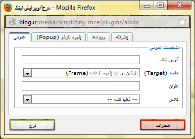 target: کادر مذکور نحوه نمایش صفحه مقصد لینک را تنظیم میکند. به این ترتیب که لینک شما می تواند در همان پنجره، در پنجره ای دیگر و یا در زبانه ای دیگر از مرور گر باز شود.