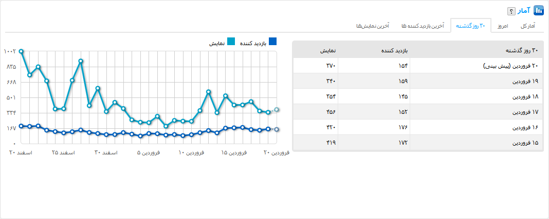 آمار بازدید و نمایش وبلاگ در هر یک از روزهای ماه در جدول و نمودار این قسمت قابل مشاهده است.