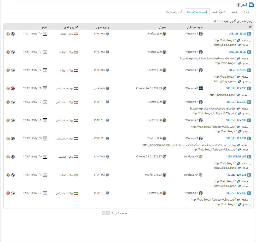 نکته: تفاوت بین "آخرین بازدیدکننده ها" و "آخرین نمایش ها" در این است که در اولی اطلاعات کاربر و در "آخرین نمایش ها" هر بازدید مورد توجه قرار گرفته. در مواردی که کاربری تنها از یکی از صفحات وبلاگ بازدید کرده باشد؛ دو جدول "آخرین بازدیدکننده ها" و "آخرین نمایش ها" یکسان خواهند بود.